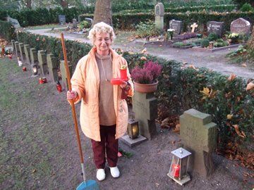 Da sich sonst kaum noch einer darum zu kümmern scheint, hat sich Frau Piotrowski zur Aufgabe gemacht, diese Gräber in ihre Pflege zu nehmen und regelmäßig für Blumenschmuck und Grablichter zu sorgen.